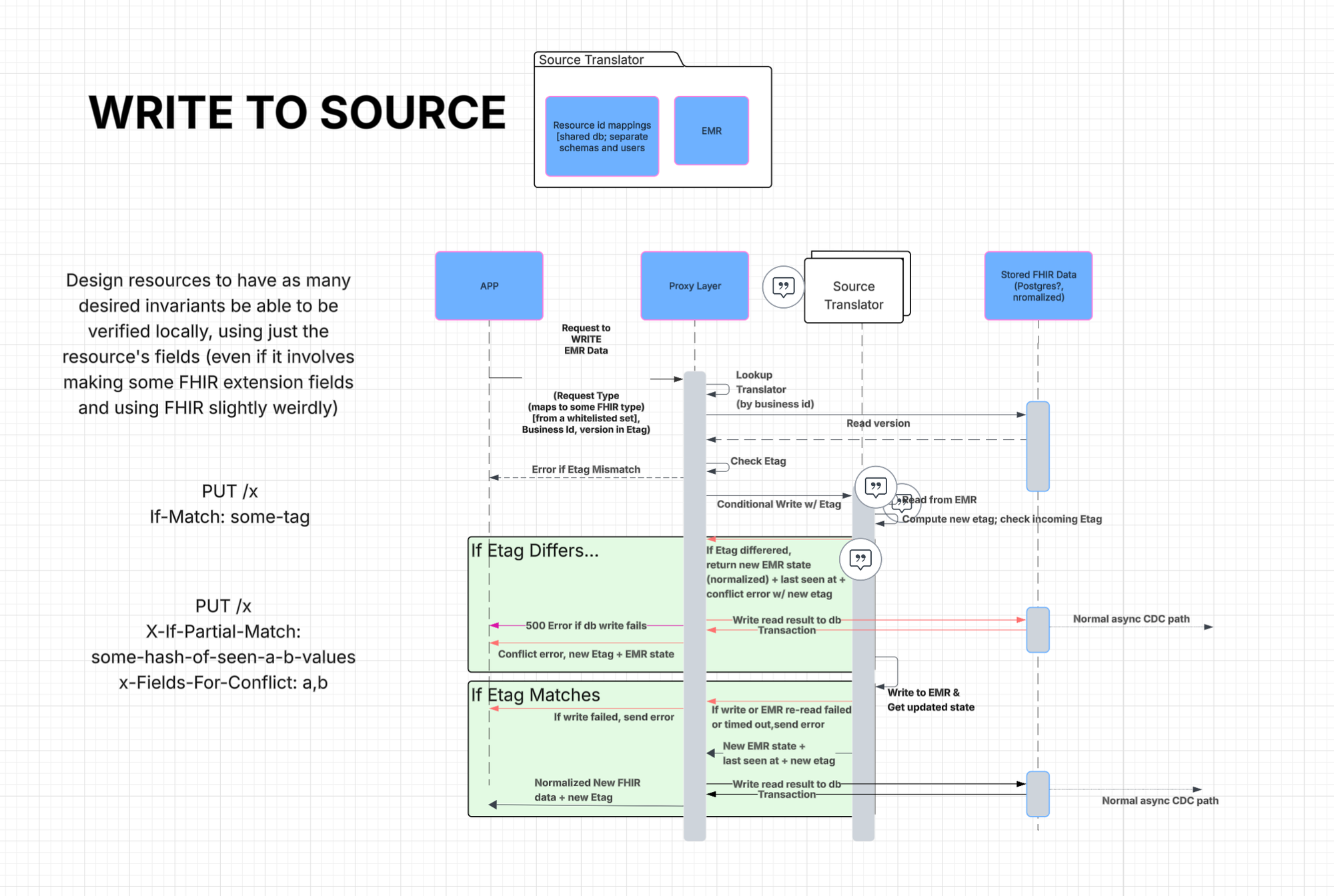 Writes enforce the same invariants in reverse. Every update carries an ETag (Entity Tag) so the proxy can detect concurrent edits and preserve read-your-own-writes. If two writers race, we return a deterministic 409 Conflict with a structured diff—never a silent overwrite.